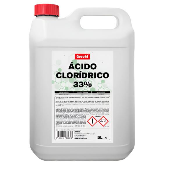 ÁCIDO CLORÍDRICO 33% 5LT- Solução transparente levemente amarelada, com odor sufocante, também conhecido como Ácido Muriático.CAMPOS DE APLICAÇÃO:- Fabrico de adubos, depuração de águas…