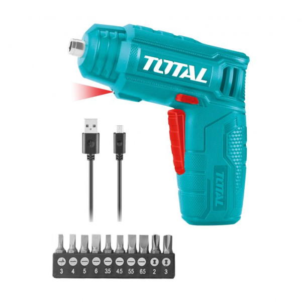 BERBEQUIM APARAFUSADOR A BATERIA TOTAL REF.TSDLI0402‣ Par máximo de 4 Nm. ‣ Inserção de 1/4’’. ‣ Luz LED. ‣ Inclui 10 acessórios de chavede parafusos. ‣ Inclui cabo USB de carga.