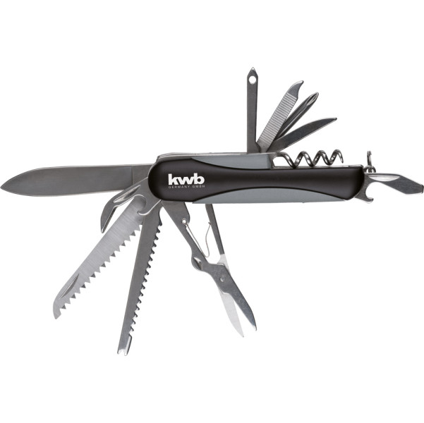 - Consiste em 11 ferramentas práticas feitas de aço inoxidável, como serras, escamador de peixe, abridor de garrafas, chave de fenda Philips e fenda, lâmina de faca, lima e saca-rolhas para abridor de garrafas e latas, furador e chaveiro, o cabo em ambos os lados consiste em uma concha de alumínio e plástico.