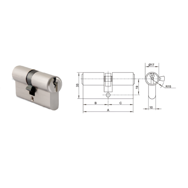 - Perfil Euro, tipo chave-chave; - 5+5 pinos (6+6 pinos como opção); - 3 chaves de latão, niquelado; - pinos de latão e molas de inox para alta precisão e longo tempo de serviço; - sulco de ombro fresado na face do cilindro que recebe o ombro da chave para melhorar a transmissão de torque para fácil abertura e melhor proteção das chaves; - came de aço sinterizado para a 30° fora do corpo do cilindro quando a chave é puxada para fora, evitando que o cilindro seja puxado para fora da fechadura pela força; - cilindros com chave igual (KA) e com chave mestra (MK) disponíveis.