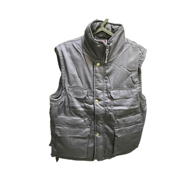 Exterior 65% poliéster, 35% algodão tecido sarja 200 grs/m2. Acolchoado 100% poliéster, 220 grs/m2. 8 bolsos exteriores. 1 bolso interior. 2 acessos caneta. 1 bolso no peito direito para telemóvel. Gola alta fecho inteiro. Ajustável nos laterais das costas. Amplia superfície para estampar nas costas. Mais largo no baixo das costas. Corta ventos nas cavas.