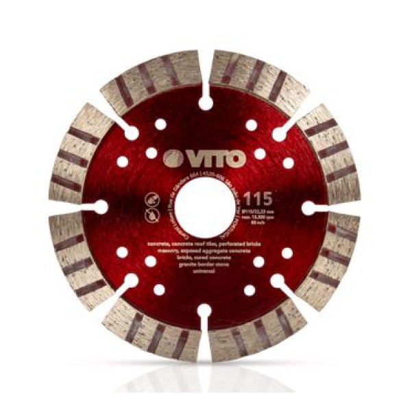 DISCO DIAMANTE 115MM GERAL OBRA PRO VITODiâmetro exterior disco115 mmFuro interior22,23 mmAltura segmento12 mmEspessura segmento2,0 mm