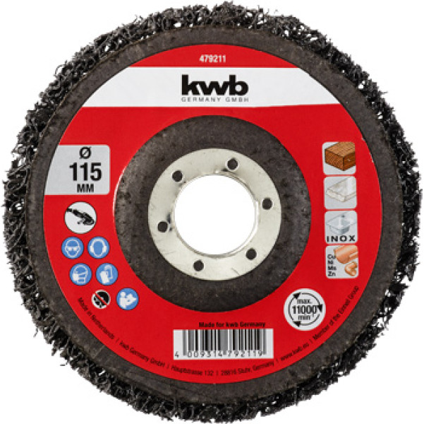 - Discos de limpeza, suporte de nylon, aglomerados com abrasivo de carboneto de silício, largura de trabalho de 13 mm, para trabalho preciso até as bordas com a borda ou a face do disco, flexíveis, para lixamento e limpeza de aço, chapas metálicas, madeira, plásticos e pedras, para todas as esmerilhadeiras angulares comuns com velocidade periférica do disco de 80 m/s.