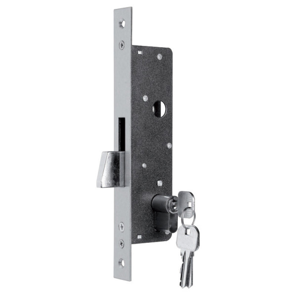 FECHADURA CANHÃO LÍNGUA CAIR EMBUTIR» Fechadura de prumo para alumínio com língua basculante, testa em inox e chapa testa de afinação em inox com entrada de cilindro.» Com Cilindro Incluído.
