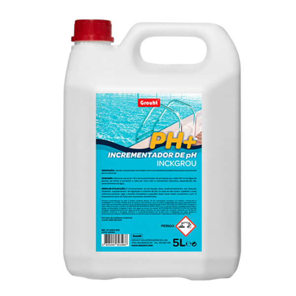 INCREMENTADORES (AUMENTA) PH+ LIQUIDO 5LT PISCINAS INCKGROU- Recomendado no ajuste do pH da água da piscina, quando se encontra inferior a 7.0 Misível com água em todas as proporções.- Isento …