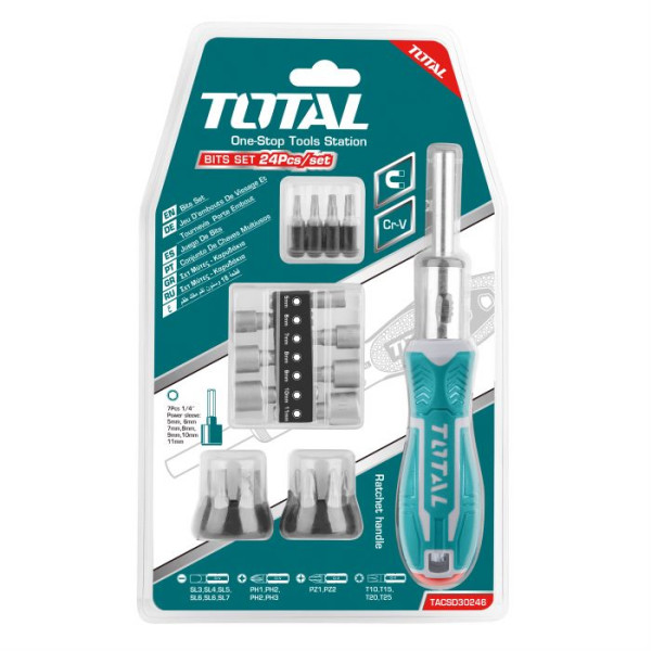2 bits Pozidrive PZ1 - PZ2 x 25 mm. 4 bits Torx: T10 - T15 - T20 - T25 x 25 mm.