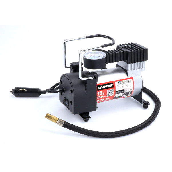 MINI COMPRESSOR DE AR MADER REF.63660Contém- Adaptador – 12 V DC- p/ automóveis, caravanas e barcos- Manómetro incorporado- Mangueira- Agulha e 2 ponteirasPressão150 PSITensão12V