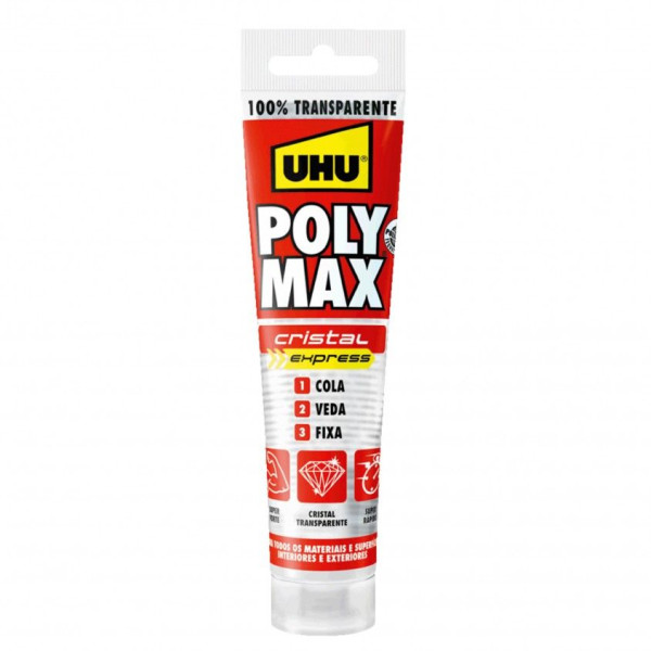 Verifique mais abaixo na página as características da cola de montagem UHU Poly Max Cristal Express. É extra forte, de elevada qualidade, de cor cristal transparente e universal, tendo por base a tecnologia única SMP. Te uma resistência final extremamente rápida e serve para colar, fixar e vedar praticamente todos os materiais (de construção) em praticamente todas as superfícies (lisas, porosas e não porosas).